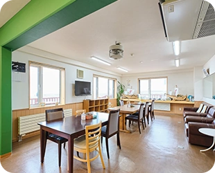 施設にお越しいただいた際は、玄関の段差を越え、長い廊下を歩く動線になっています。